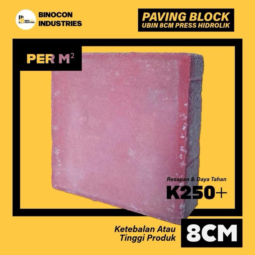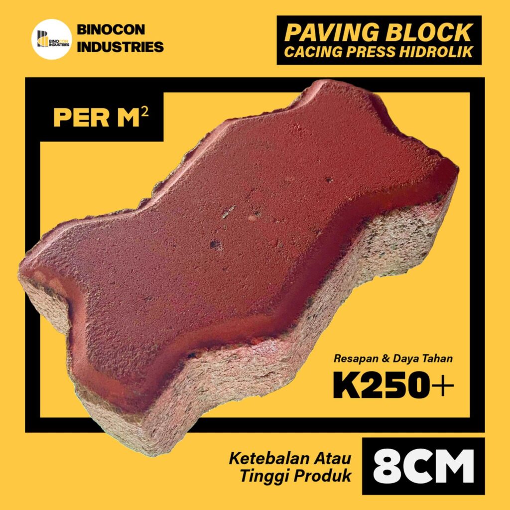 Binocon Industries Paving Block Cacing 8cm Merah Press Hidrolik 11,2×22,5cm Tebal 8cm K-250 s/d K-300 Warna Merah 39 Pcs Per M² Resapan & Daya Tahan K250+ – K250